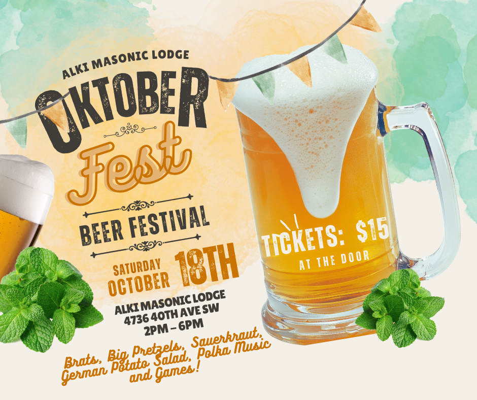 Alki Masonic Lodge is holding its annual Oktoberfest on Saturday, October 18 beginning at 2 p.m. at the Alki Masonic Center. Featuring brats, big pretzels, sauerkraut, and German potato salad. There will also be German-style beer from Georgetown Brewery. And games. Admission is $15 at the door.