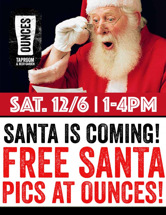 Saturday, December 6 | 1-4 pmStop in to Ounces anytime between 1-4 pm to snap your FREE family & pet pics with Santa! Skip the wait in line too! Get on the waitlist when you arrive, then grab beer & some food, and we’ll text you when it’s your turn to meet Santa! [PS – Our Santa is the real deal.]