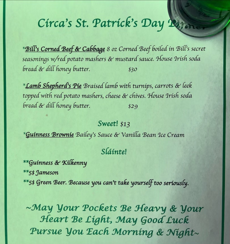 We are celebrating St. Patrick’s day 3/17 at Circa with the following dinner specials. The regular menu will also be available.