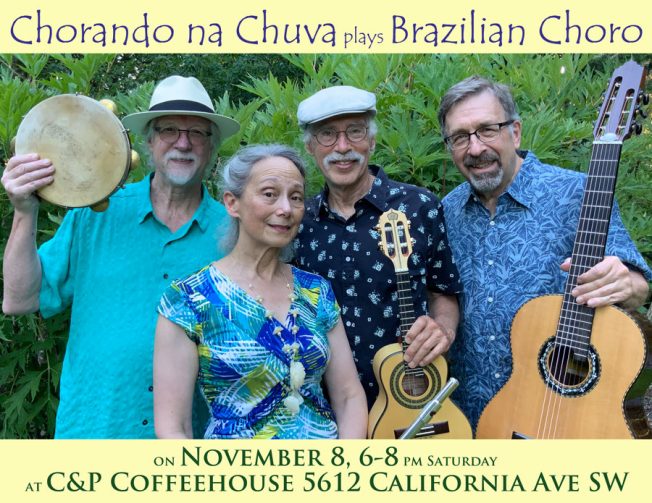 Chorando na Chuva (Crying in the Rain) has performed around the Pacific Northwest since 2010, beginning under the name Choro Tocando. They host the monthly roda de choro, now in its 12th year, and also frequently perform or offer workshops and rodas at BrasilFest and Northwest Folklife festivals. Although Brazilian choro music is the heart of Chorando na Chuva’s polished performance, the group also mixes it up with baião, samba, and maxixe. Group members KTzinha (vocals and flute), Paul Korsmo (vocals and 7-string guitar, Arthur Knapp (guitar and cavaquinho), and Wayne Organ (percussion) enjoy playing off each others’ talents to display how delightful choro is.