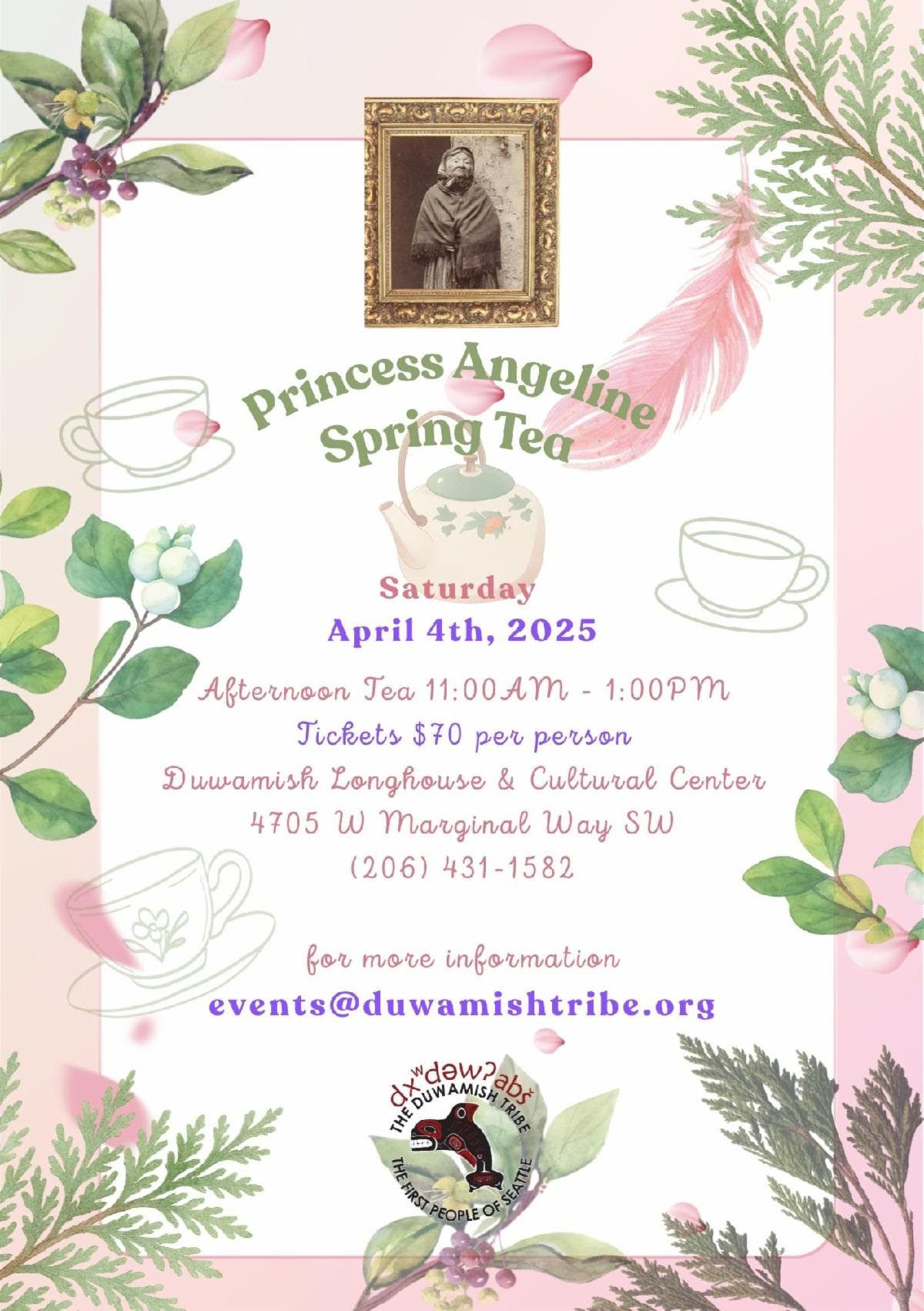 Join us for the Princess Angeline Spring Tea at the Duwamish Longhouse on April 4th from 11 am–1 pm as we gather in remembrance of Princess Angeline Kikisoblu and her enduring legacy. Enjoy tea and refreshments in the beautiful Longhouse as we come together in community.