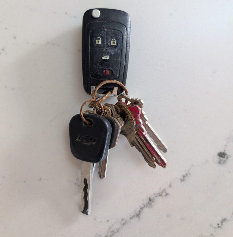 Found these keys on the concrete Safe Street barriers at Alki Ave SW and 64th PL SW this morning, Feb 6. Somewhat stuck together, might be old enough that someone has replaced them, but they won’t have to worry that they were stolen. I have taken them home, can return if someone can identify them.