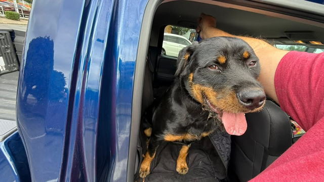 Very sweet and apparently well cared for female Rottweiler mix. She looks young and likes people, good with other dogs. No collar (she’s wearing a borrowed collar), no chip.