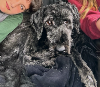 Rose and Travis’ new dog jumped the fence, and they would love everyone’s help watching for her. She’s a 2-year old black labradoodle, weights 40 lbs. She may answer to Frankie or Princess.